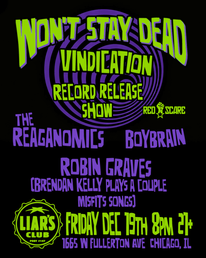 Won’t Stay Dead will have their record release show in Chicago on December 19th at Liar’s Club, featuring The Reaganomics, Boybrain and and special guest Robin Graves (Brendan Kelly plays a couple Misfits songs).
